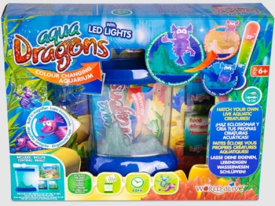 Vienkārši pievienojiet ūdeni, un Aqua Dragons izšķilsies 2-3 dienu laikā. Aquadragons izaug līdz 1,5 cm garumā. Barojiet ik pēc 2-3 dienām, lai redzētu, kā viņi ēd, aug un peld. Tvertne ar iebūvētu palielinājumu. Krāsu maiņas kalni un LED gaismas. Izmēri: 8H x 35W x 26Dcm. Nepieciešamās baterijas: 2x AAA (iekļautas).